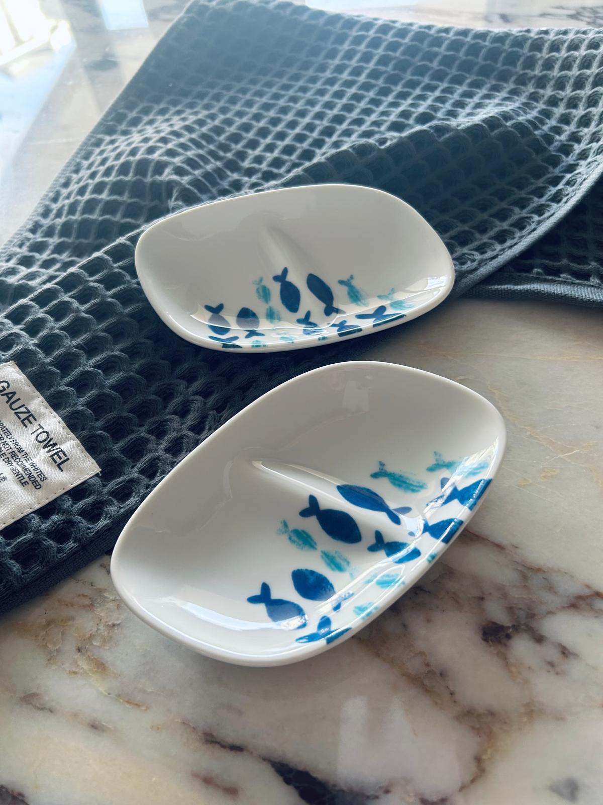 עיטור הדגיגים הכחולים מזכיר חופים יווניים,